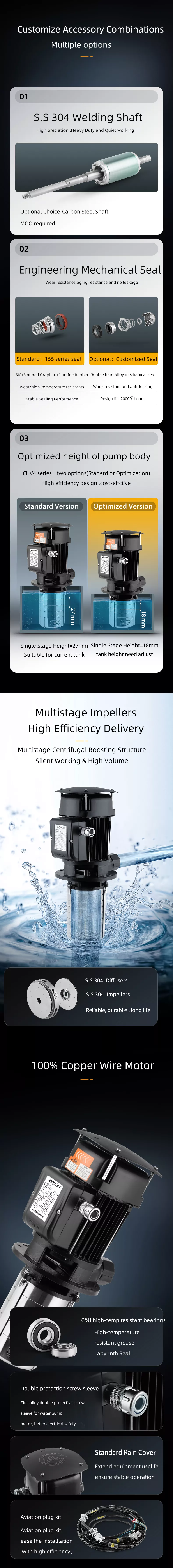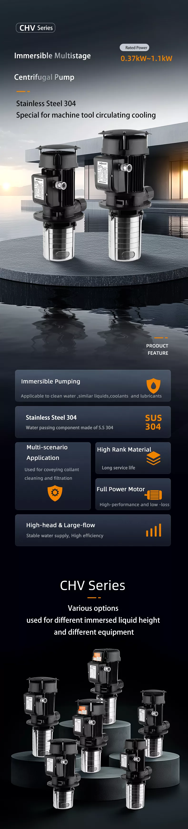 以下は、CHV シリーズの紹介です。 CHV 浸漬型多段遠心ポンプは、特に工作機械の冷却潤滑油の圧送用に設計されており、ポンプスタックが圧送液に浸漬された状態でタンクの上部に取り付けられます。 STAIRS SBK ポンプには、必要な流量、圧力、長さを提供するために、さまざまなポンプ サイズとさまざまな段数が用意されています。