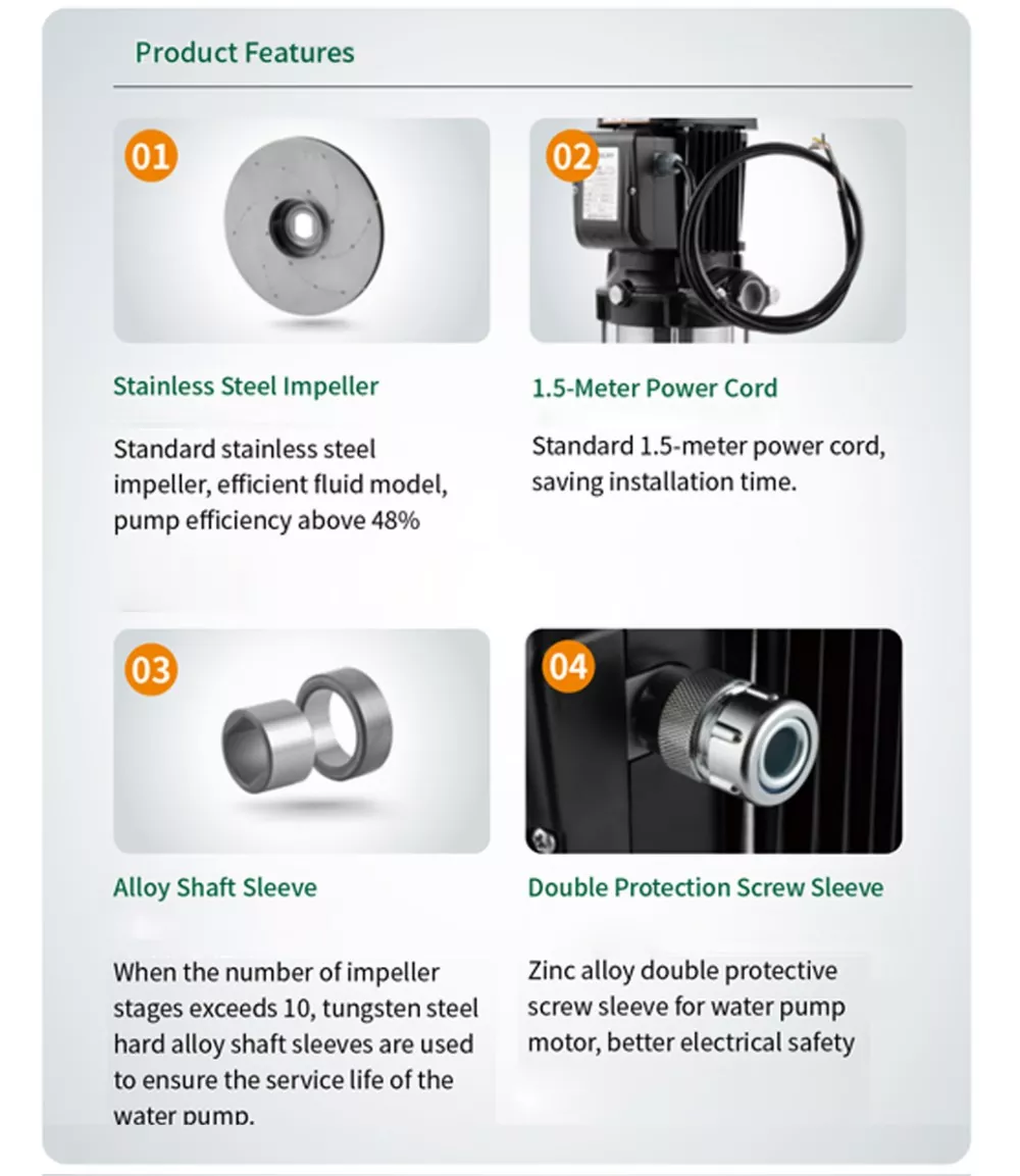 ・超硬合金+フッ素ゴムのメカニカルシールにより漏れが少なく、エネルギー消費が少なく、滑らかで静かな運転を実現します。