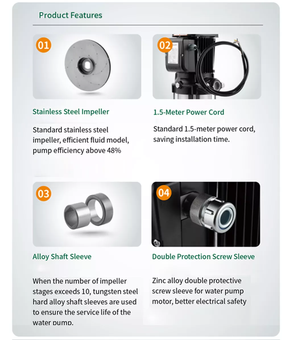 羽根車の数を変更することでポンプ揚程を調整でき、さまざまな要件に対応できます。きれいな水または同様の特性を持つ液体に適していますが、特定のモデルは腐食性媒体用にカスタマイズできます。
